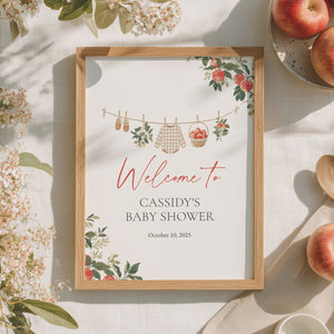 This listing is for an apple baby shower welcome sign template that you can edit yourself at Corjl.com. Corjl is an online editing software that allows you to access and edit your template right in your browser.