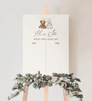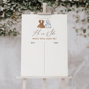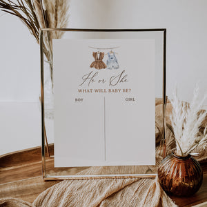 Welcome friends and family to your gender reveal with this boho baby clothes themed sign! This is a template that you can edit yourself at Corjl.com, then download and print with a printing service of your choice or send as an digital invitation.