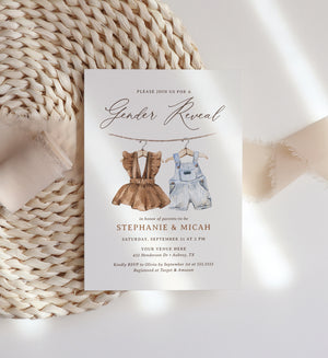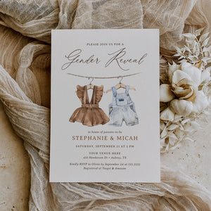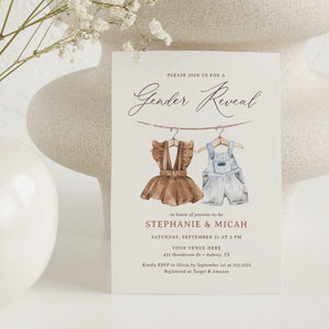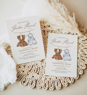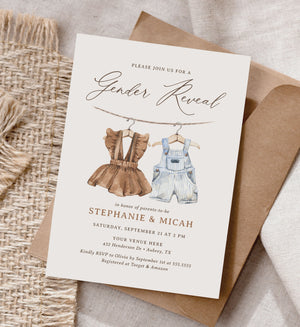 Invite friends and family to your gender reveal with this boho baby clothes invitation! This is a template that you can edit yourself at Corjl.com, then download and print with a printing service of your choice or send as an digital invitation.