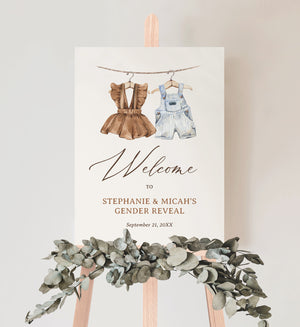 Welcome friends and family to your gender reveal with this boho baby clothes themed sign! This is a template that you can edit yourself at Corjl.com, then download and print with a printing service of your choice or send as an digital invitation.