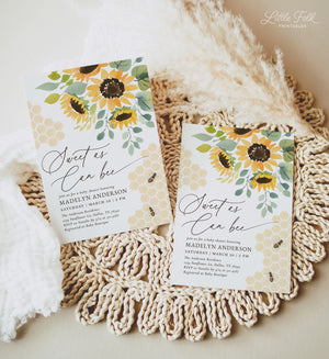 Celebrate a little one on the way with this bee baby shower invitation! This is a template that you can edit yourself at Corjl.com, then download and print with a printing service of your choice or send as a digital invitation.