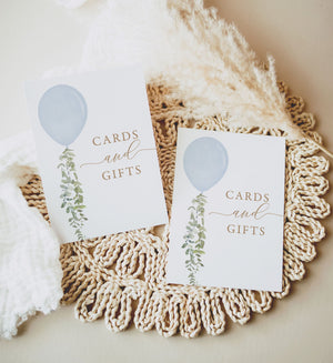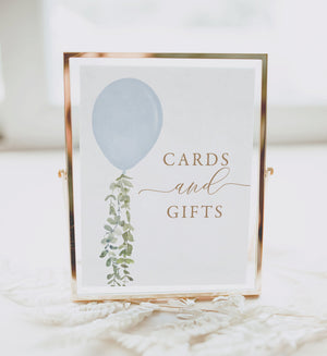 This listing is for an instant download, print-ready Cards and Gifts sign in the blue watercolor balloon baby shower theme. The following files will be included with your purchase: