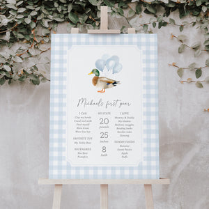 Add a finishing touch to your little one's duck themed birthday party with this printable milestone sign template. This is a template that you can edit yourself at Corjl.com, then download and print at home or with a printing service of your choice.