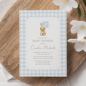Blue Gingham Golden Doodle Baby Shower Invitation