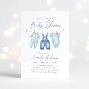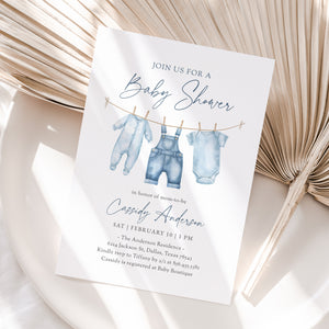 Celebrate a little one on the way with this blue jean baby shower invitation! This is a template that you can edit yourself at Corjl.com, then download and print with a printing service of your choice or send as a digital invitation.