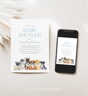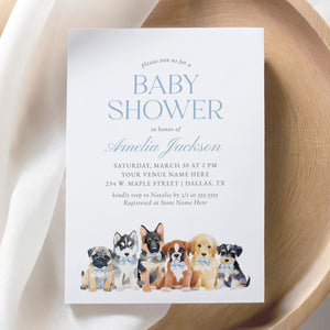 Celebrate a little one on the way with this puppy baby shower invitation! This is a template that you can edit yourself at Corjl.com, then download and print with a printing service of your choice or send as a digital invitation.