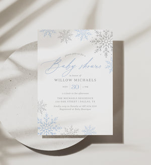 Celebrate a little one on the way with this snowflake baby shower invitation! This is a template that you can edit yourself at Corjl.com, then download and print with a printing service of your choice or send as a digital invitation.