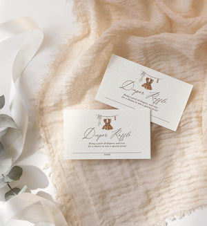 Invite friends and family to bring a pack of diapers to you or your loved one's baby shower with this baby clothes themed diaper raffle ticket! This is a template that you can edit yourself at Corjl.com, then download and print with a printing service of your choice.
