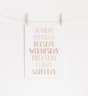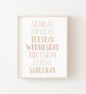 Introduce your kiddo to the days of the week with this hand-lettered watercolor poster. Decorate a wall in your little one's nursery, bedroom, or playroom with this educational print to encourage learning everyday.