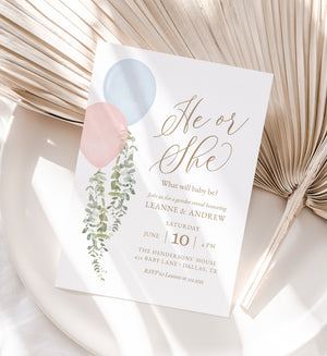 Invite friends and family to your gender reveal with this pink and blue balloon invitation! This is a template that you can edit yourself at Corjl.com, then download and print with a printing service of your choice or send as an evite.