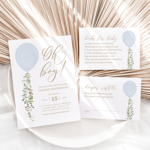 Editable Blue Balloon Baby Shower Invitation Suite Template - Set of 3