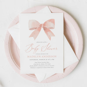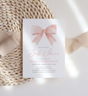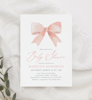 Celebrate a little one on the way with this pink bow baby shower invitation! This is a template that you can edit yourself at Corjl.com, then download and print with a printing service of your choice or send as a digital invitation.