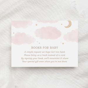 Request that friends and family bring a book instead of a card to you or your loved one's baby shower with this pink watercolor moon and stars 'books for baby' insert! This is a template that you can edit yourself at Corjl.com, then download and print with a printing service of your choice.
