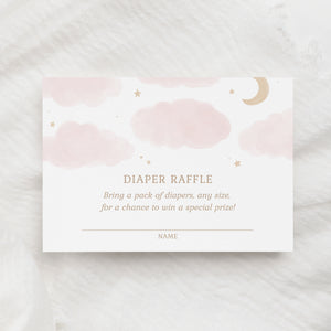 Invite friends and family to bring a pack of diapers to you or your loved one's baby shower with this pink watercolor moon and stars diaper raffle ticket! This is a template that you can edit yourself at Corjl.com, then download and print with a printing service of your choice.