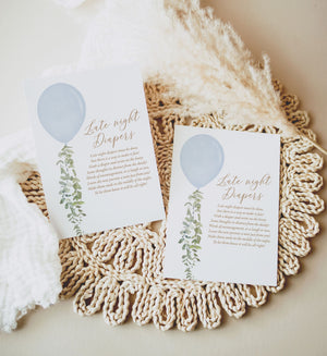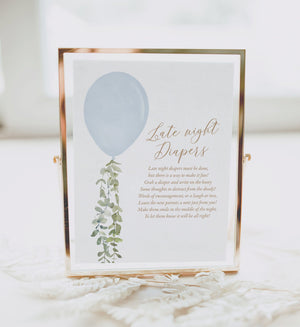 This listing is for an instant download, print-ready 'Late Night Diapers' sign in the blue watercolor balloon baby shower theme. The following files will be included with your purchase: