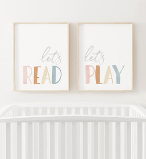 Let's read! Let's play! Perfect for a playroom or kids' room, this set of two watercolor prints will brighten up any space.