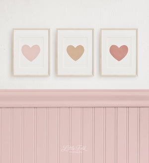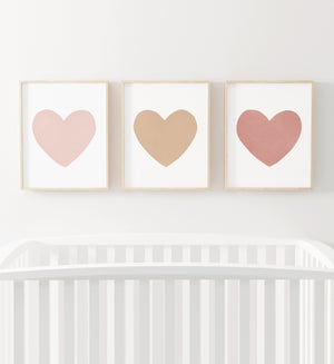 Brighten up your little one's nursery, bedroom, or playroom with this set of 3 watercolor heart prints! Perfect as small framed prints on a shelf, or large posters over a dresser, crib, or bed.
