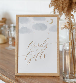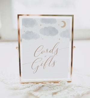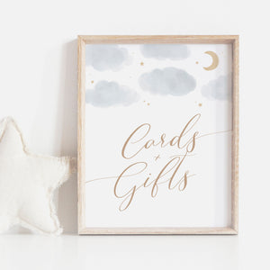 This listing is for an instant download, print-ready Cards and Gifts sign in the blue watercolor moon and stars baby shower theme. The following files will be included with your purchase: