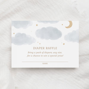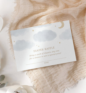Invite friends and family to bring a pack of diapers to you or your loved one's baby shower with this blue watercolor moon and stars diaper raffle ticket! This is a template that you can edit yourself at Corjl.com, then download and print with a printing service of your choice.