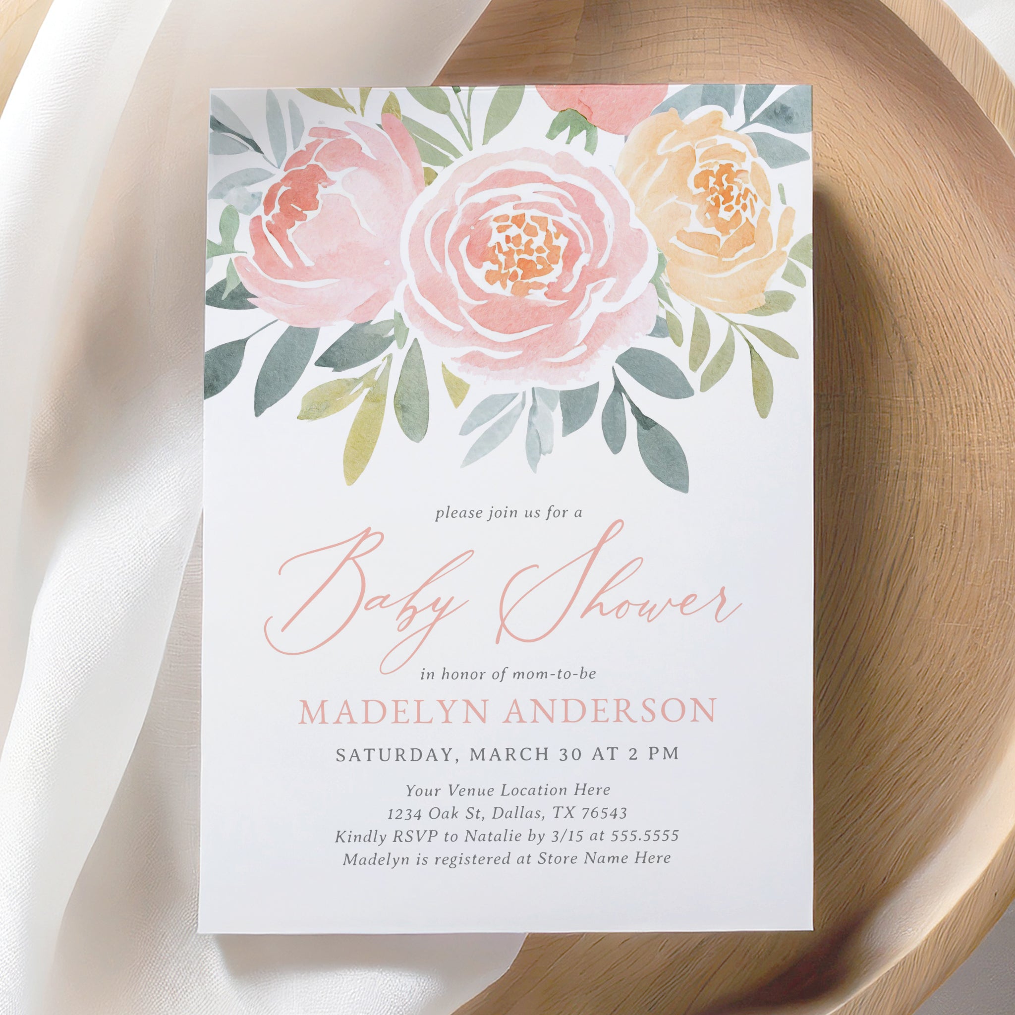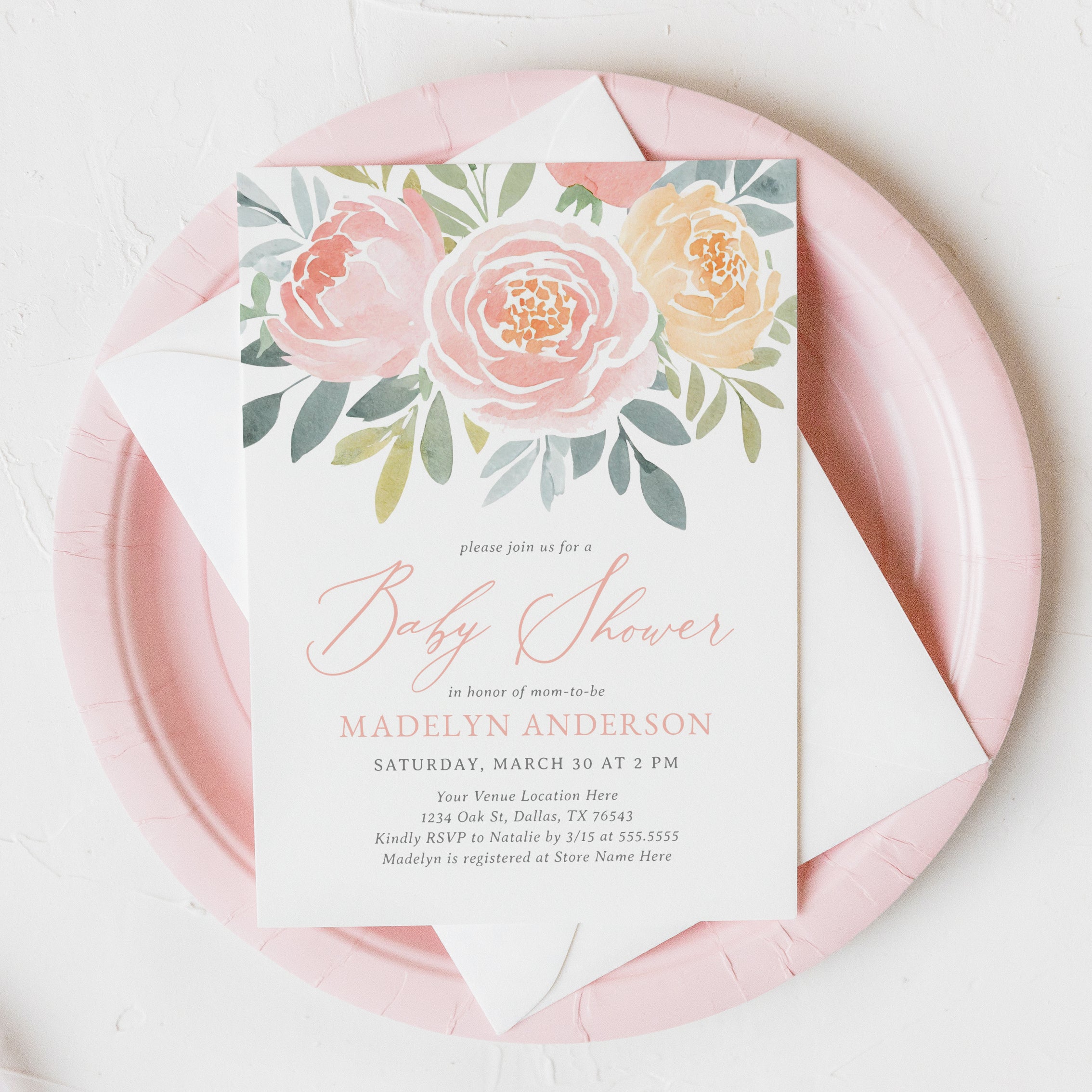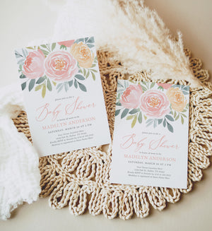 Celebrate a little one on the way with this floral baby shower invitation! This is a template that you can edit yourself at Corjl.com, then download and print with a printing service of your choice or send as a digital invitation.