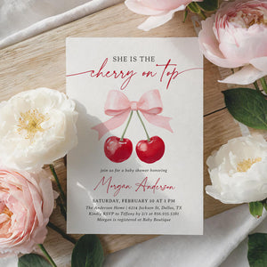 Celebrate a little one on the way with this cherry baby shower invitation! This is a template that you can edit yourself at Corjl.com, then download and print with a printing service of your choice or send as a digital invitation.