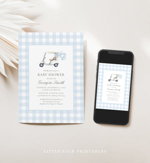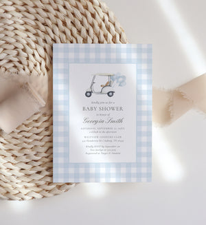 Editable Blue Gingham Golf Baby Shower Invitation Template