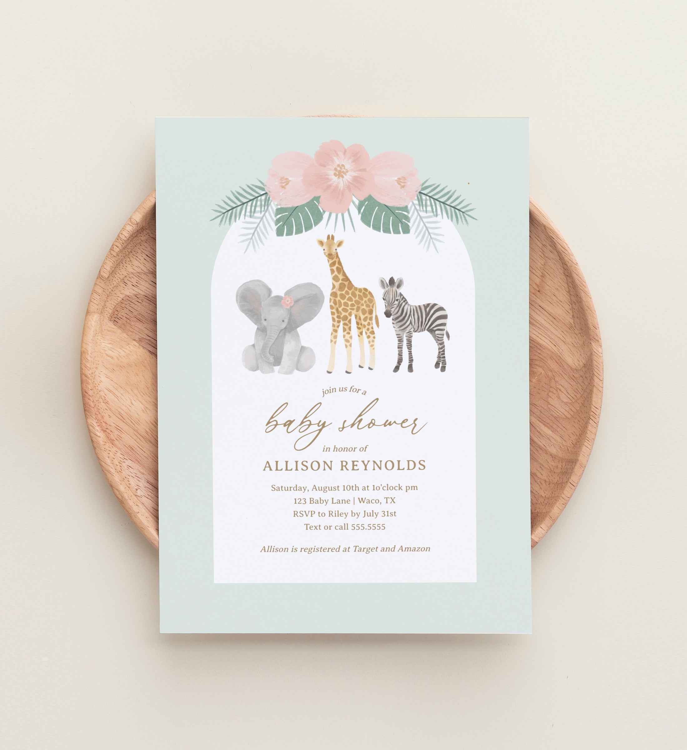 Celebrate a little one on the way with this safari baby shower invitation! This is a template that you can edit yourself at Corjl.com, then download and print with a printing service of your choice or send as a digital invitation.