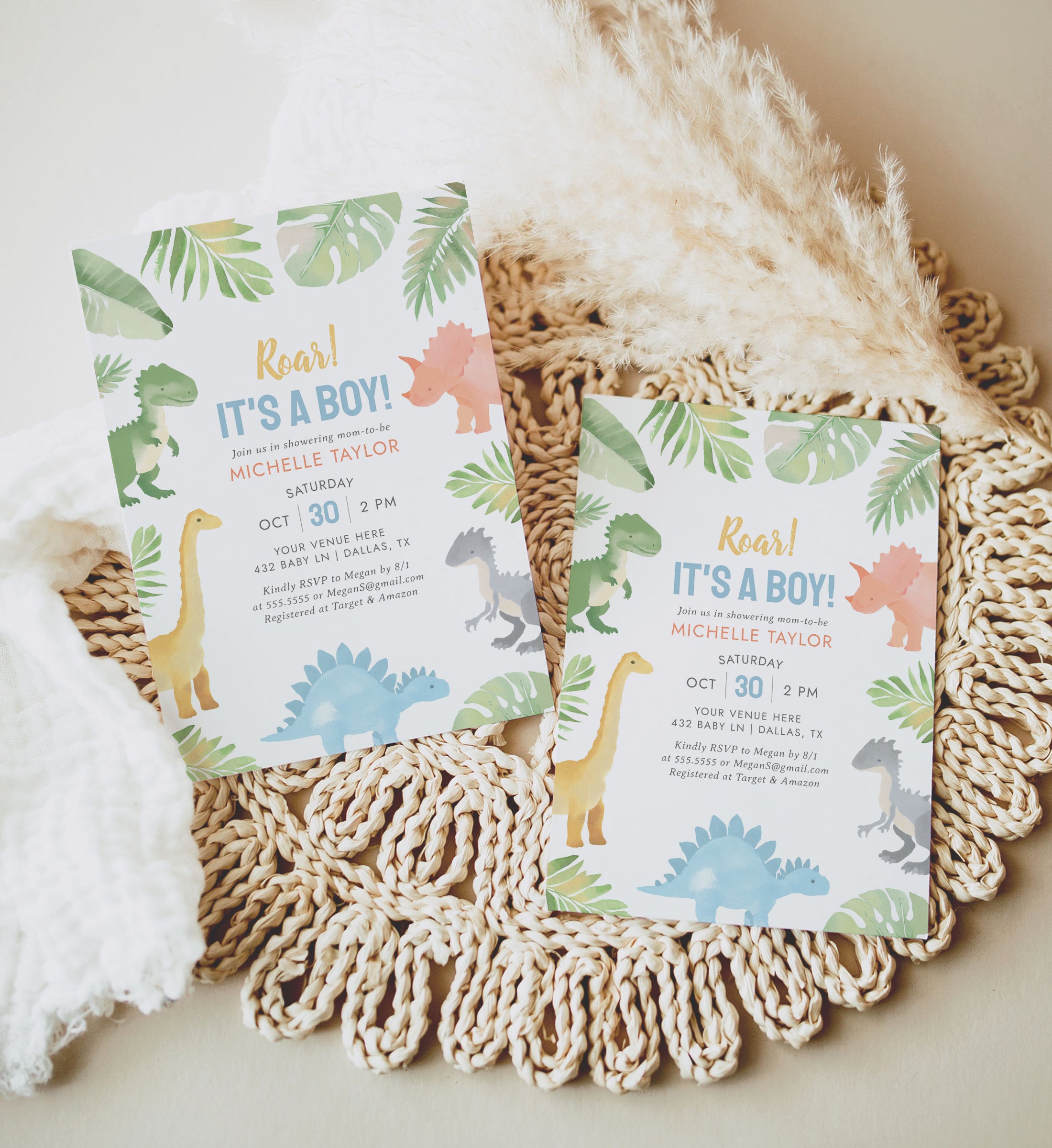 Celebrate a little one on the way with this dinosaur baby shower invitation! This is a template that you can edit yourself at Corjl.com, then download and print with a printing service of your choice or send as a digital invitation.