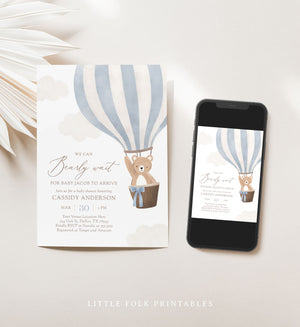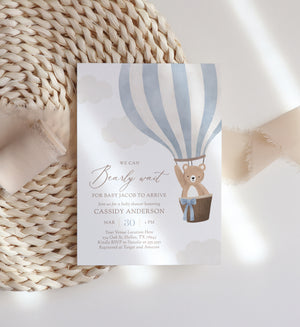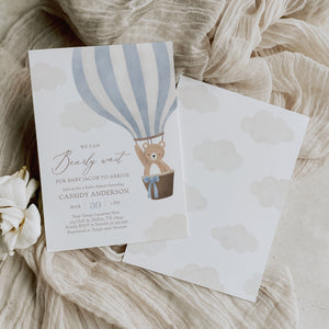 Editable Blue Teddy Bear Hot Air Balloon Baby Shower Invitation Template