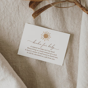 Celebrate a little one on the way with this sunshine baby shower invitation suite, including invitation, books for baby card, and diaper raffle ticket. This is a set of templates that you can edit yourself at Corjl.com, then download and print with a printing service of your choice or send as a digital invitation.
