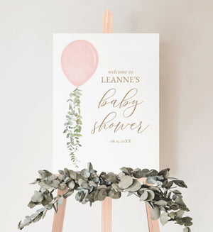 Welcome guests to your baby shower with this pink balloon welcome sign! This is a template that you can edit yourself at Corjl.com, then download and print with a printing service of your choice.