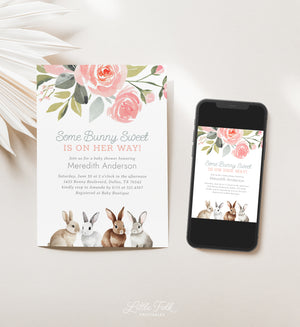 Celebrate a little one on the way with this bunny baby shower invitation! This is a template that you can edit yourself at Corjl.com, then download and print with a printing service of your choice or send as a digital invitation.