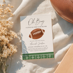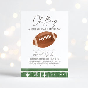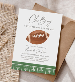 Celebrate your little one on the way with this football baby shower invitation! This is a template that you can edit yourself at Corjl.com, then download and print with a printing service of your choice or send as a digital invitation.