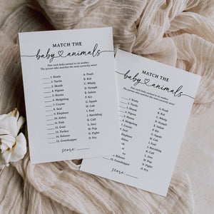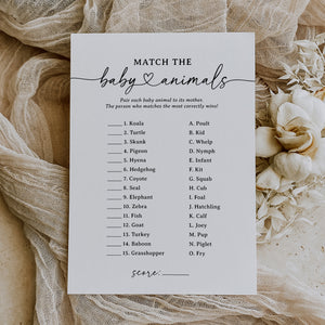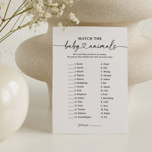 Add a finishing touch to your baby shower with this minimalist baby shower animal matching game. This is a template that you can edit yourself at Corjl.com, then download and print at home or with a printing service of your choice.