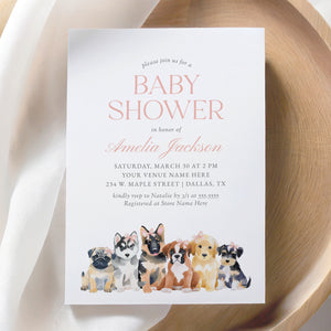 Celebrate a little one on the way with this puppy baby shower invitation! This is a template that you can edit yourself at Corjl.com, then download and print with a printing service of your choice or send as a digital invitation.