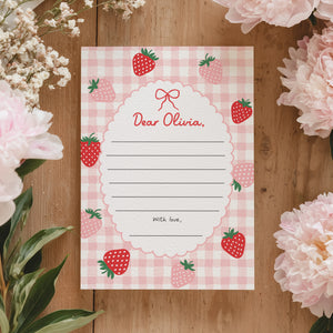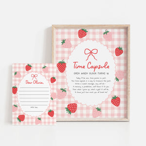 Celebrate your child's special day with this strawberry birthday themed time capsule! This is a template that you can edit yourself at Corjl.com, then download and print with a printing service of your choice or send as a digital invitation.