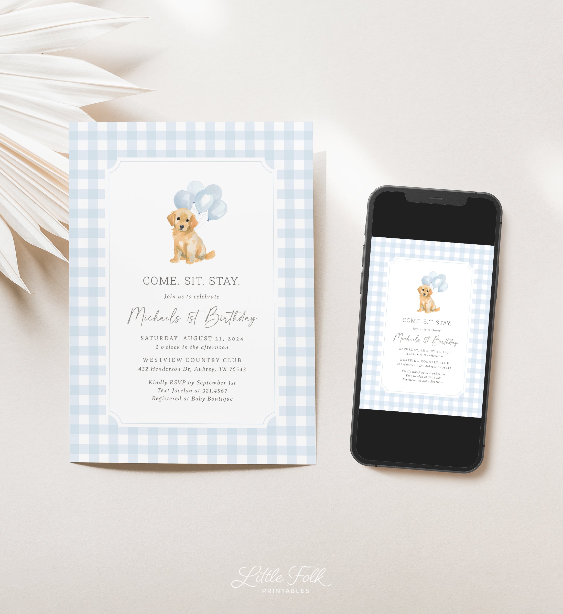 Blue Gingham Golden Retriever Birthday Invitation