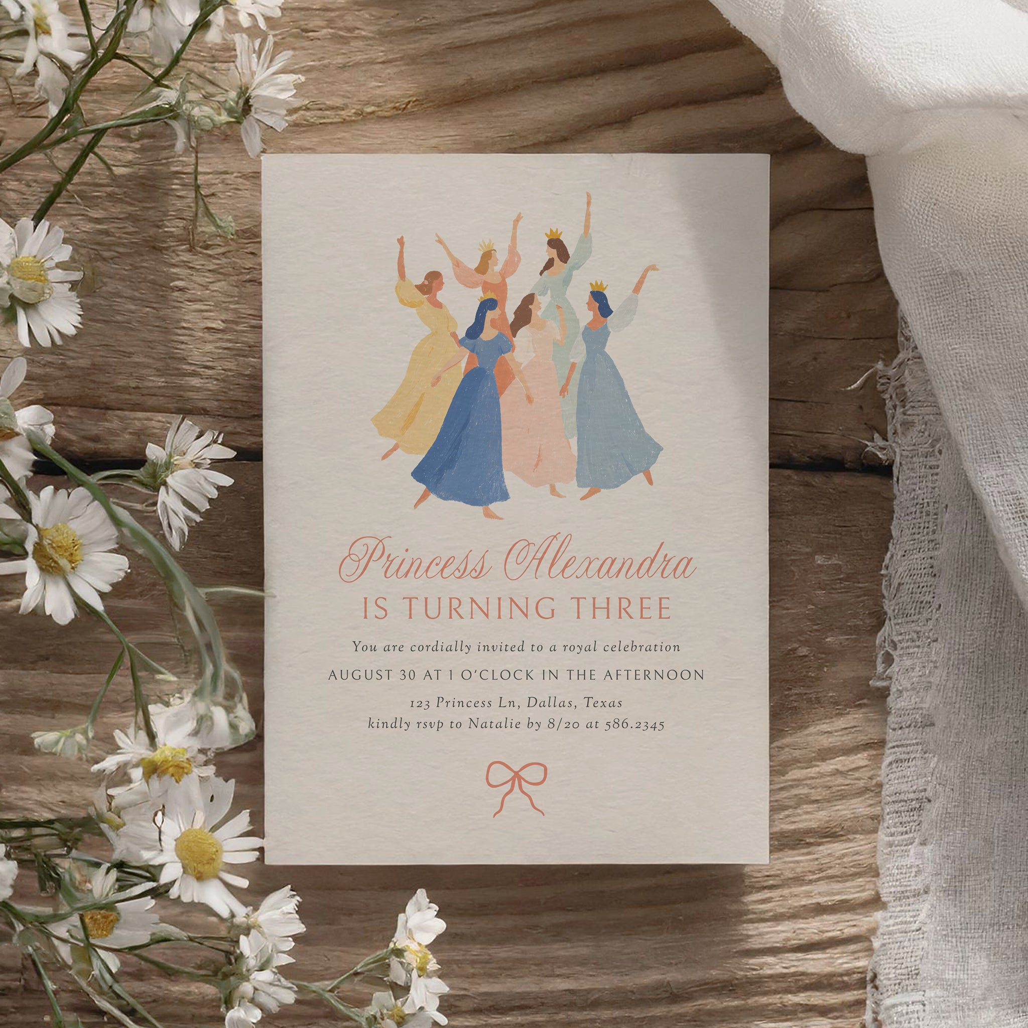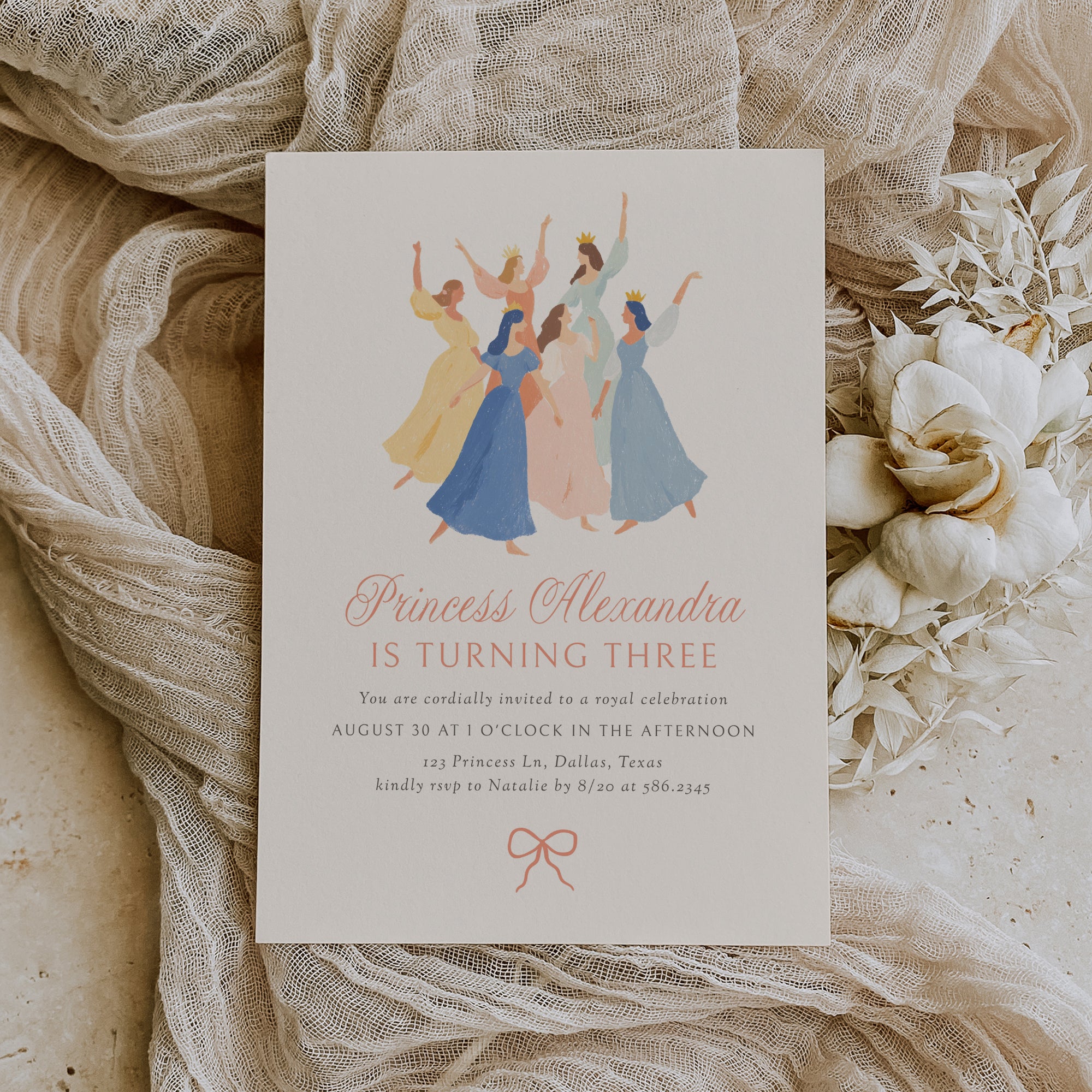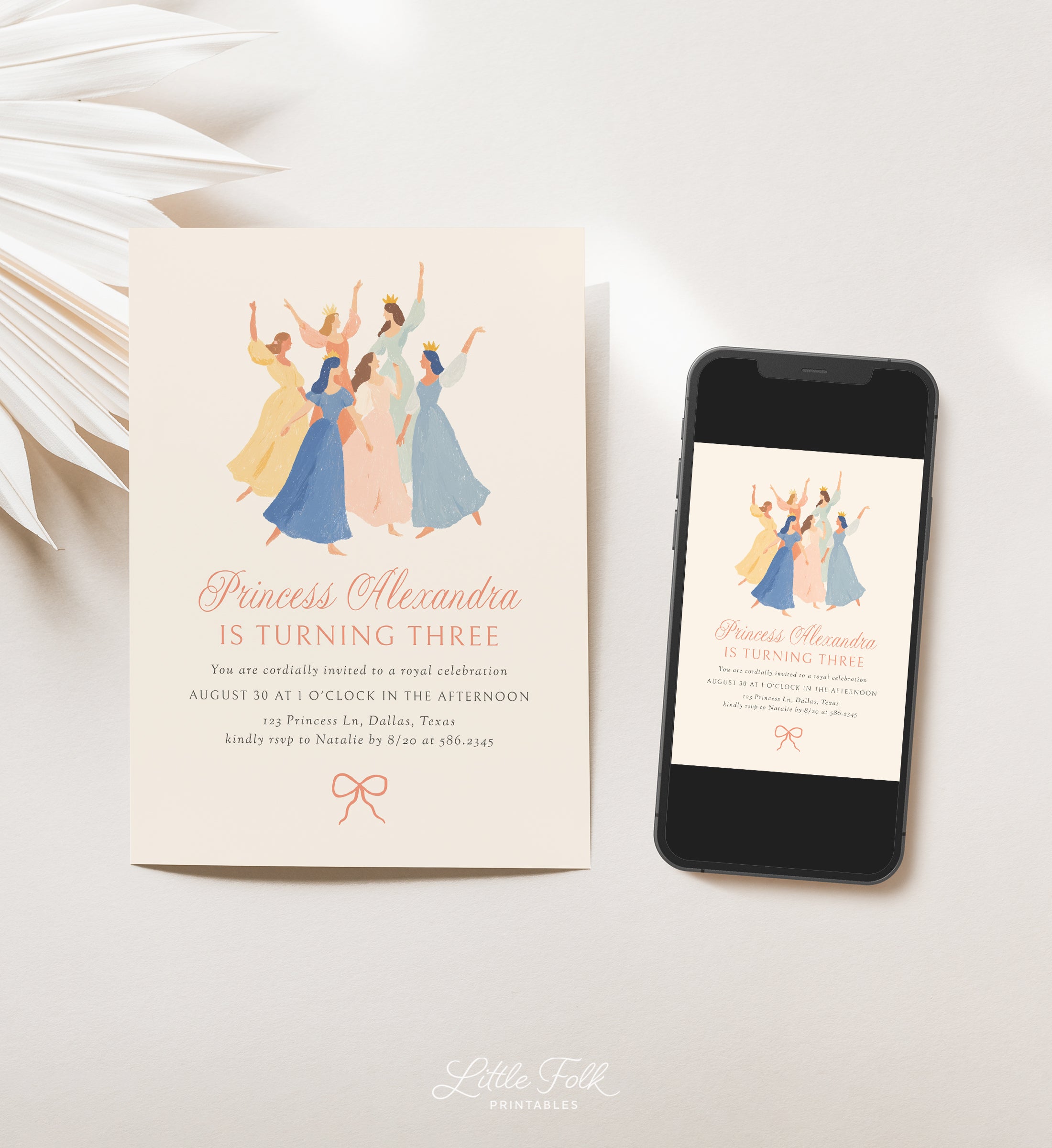 Celebrate your little one's special day with this princess birthday party invitation! This is a template that you can edit yourself at Corjl.com, then download and print with a printing service of your choice or send as a digital invitation.
