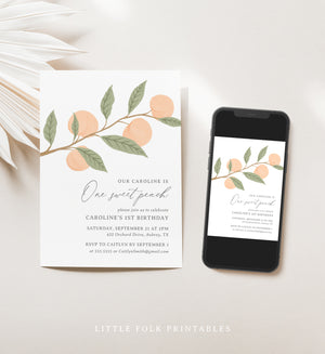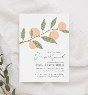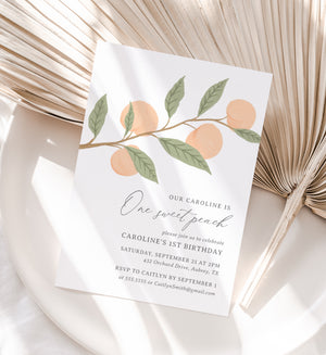 Celebrate your little one's special day with this peach birthday party invitation! This is a template that you can edit yourself at Corjl.com, then download and print with a printing service of your choice or send as an evite.