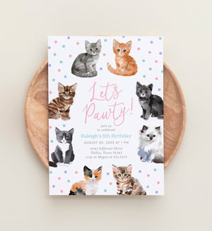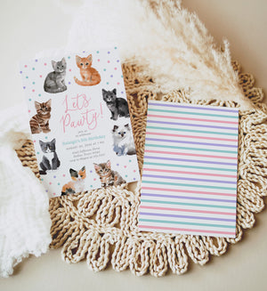 Celebrate your little one's special day with this kitten themed birthday party invitation! This is a template that you can edit yourself at Corjl.com, then download and print with a printing service of your choice or send as an evite.