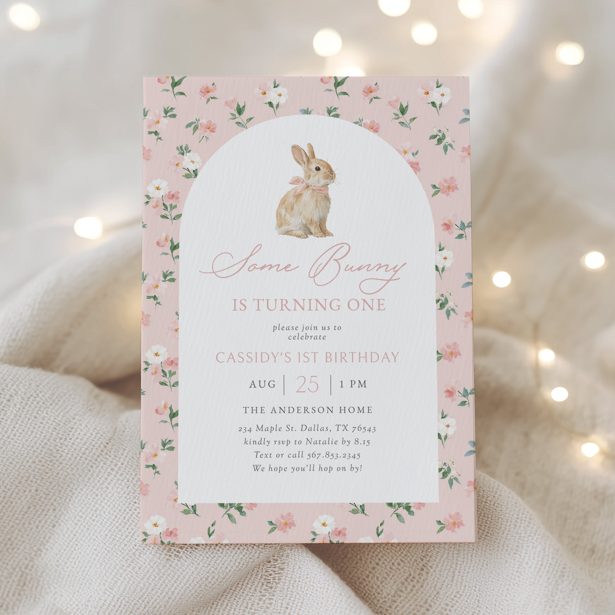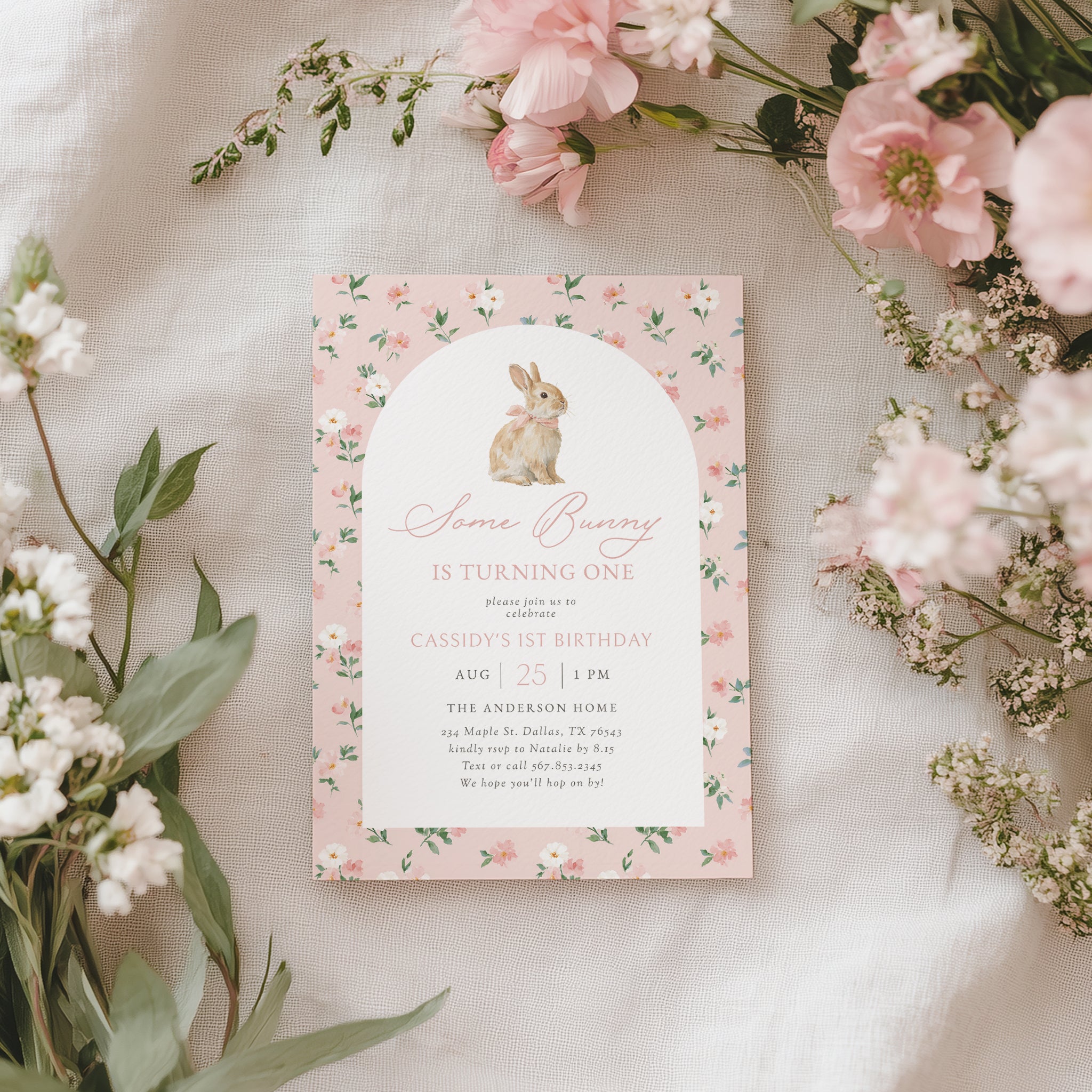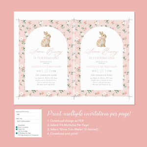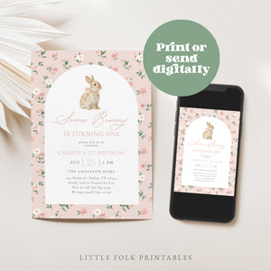 Celebrate your child's special day with this pink floral bunny birthday invitation! This is a template that you can edit yourself at Corjl.com, then download and print with a printing service of your choice or send as a digital invitation.