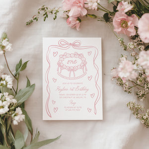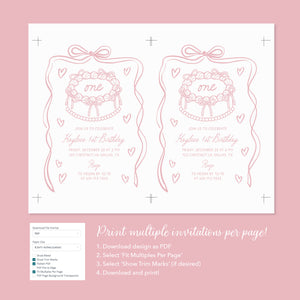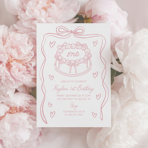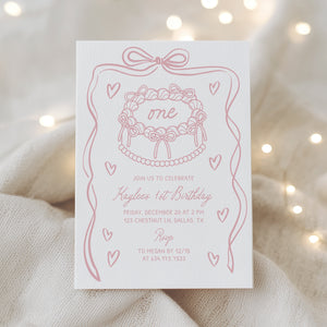 Pink Hand Drawn Bow First Birthday Invitation