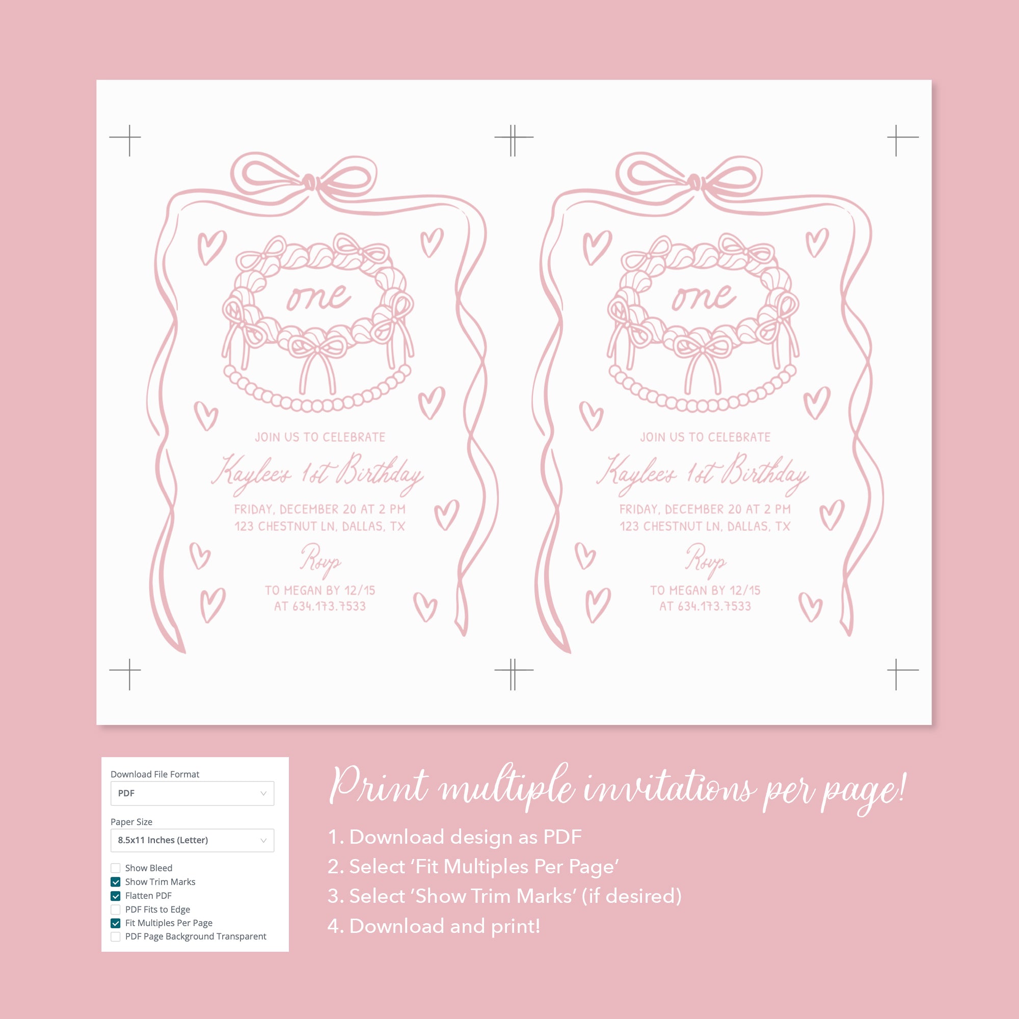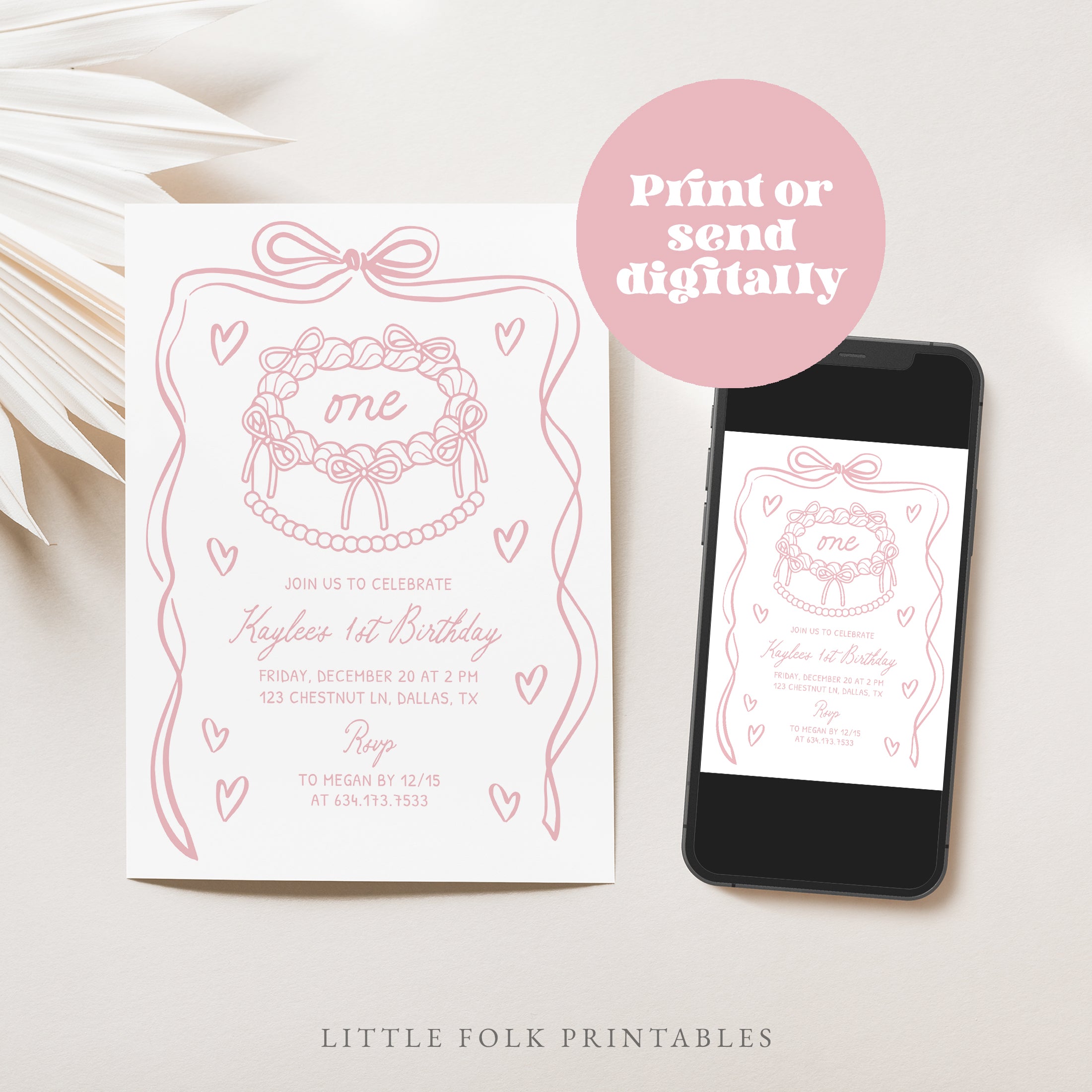 Celebrate your child's special day with this pink bow birthday invitation! This is a template that you can edit yourself at Corjl.com, then download and print with a printing service of your choice or send as a digital invitation.
