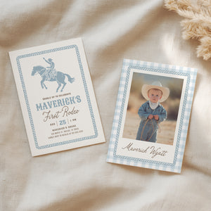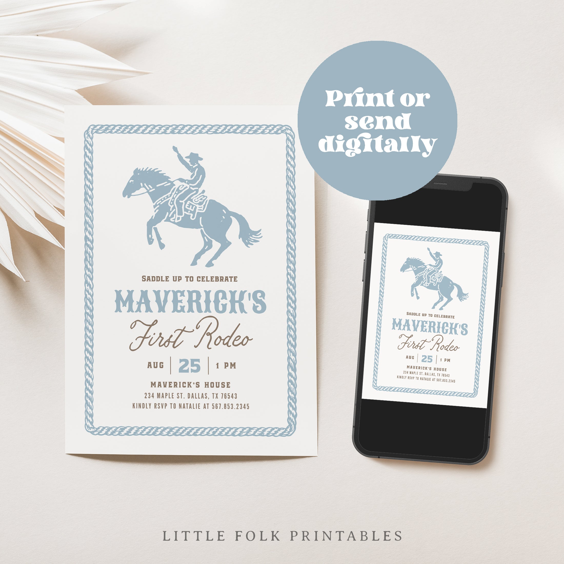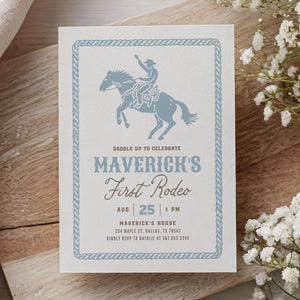 Celebrate your child's special day with this dusty blue first rodeo birthday invitation! This is a template that you can edit yourself at Corjl.com, then download and print with a printing service of your choice or send as a digital invitation.