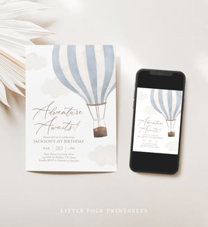 Editable Blue Hot Air Balloon Birthday Invitation Template