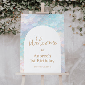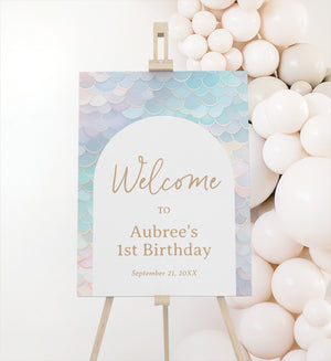 Celebrate your little one's special day with this mermaid birthday welcome sign! This is a template that you can edit yourself at Corjl.com, then download and print with a printing service of your choice or send as an evite.