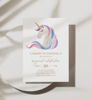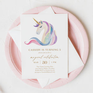 Celebrate your little one's special day with this unicorn birthday party invitation! This is a template that you can edit yourself at Corjl.com, then download and print with a printing service of your choice or send as a digital invitation.