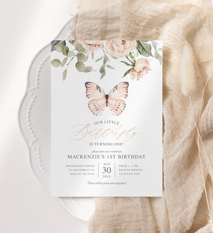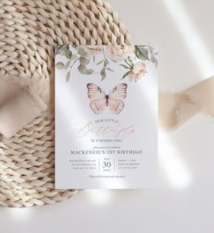 Celebrate your little one's special day with this butterfly birthday party invitation! This is a template that you can edit yourself at Corjl.com, then download and print with a printing service of your choice or send as an evite.