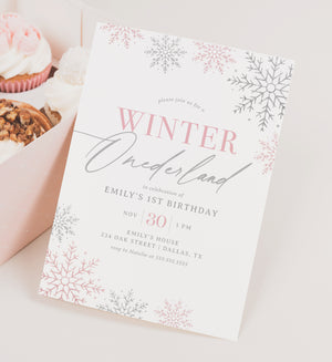 Editable Pink Winter Onederland Birthday Party Invitation Template