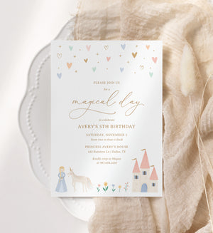 Celebrate your little one's special day with this princess birthday party invitation! This is a template that you can edit yourself at Corjl.com, then download and print with a printing service of your choice or send as a digital invitation.